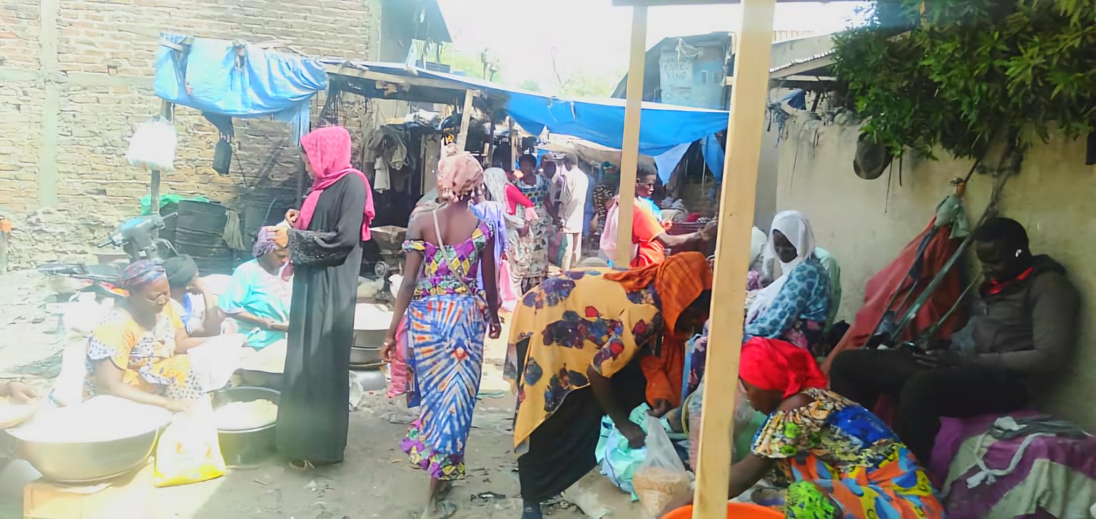 Le marché de Dembé est bondé et les vendeurs débordent jusqu’au bord de la route, créant des embouteillages. Dans la plupart des moulins de pâte d’arachide, les seaux et autres récipients sont alignés en attente de leur tour.
